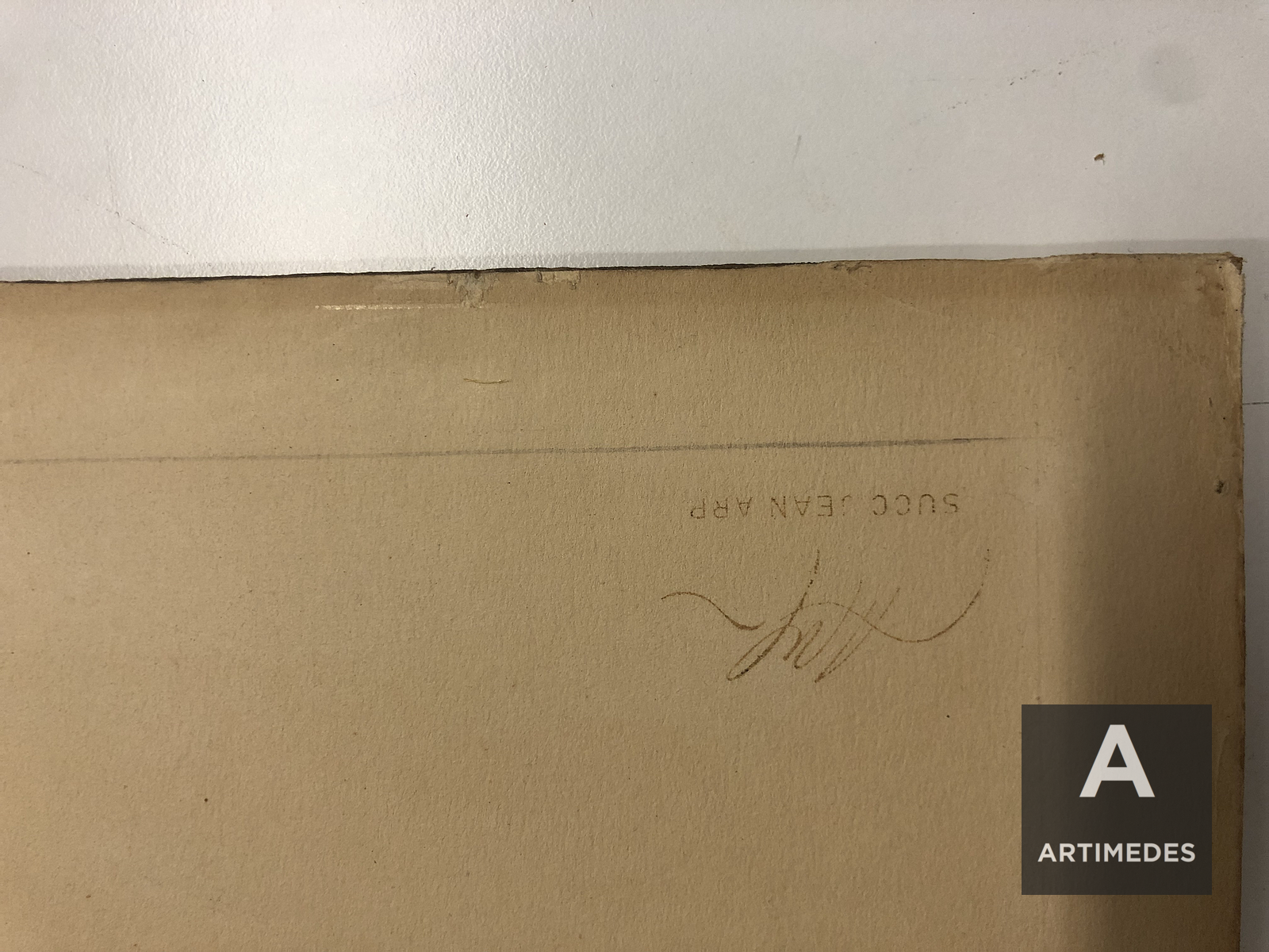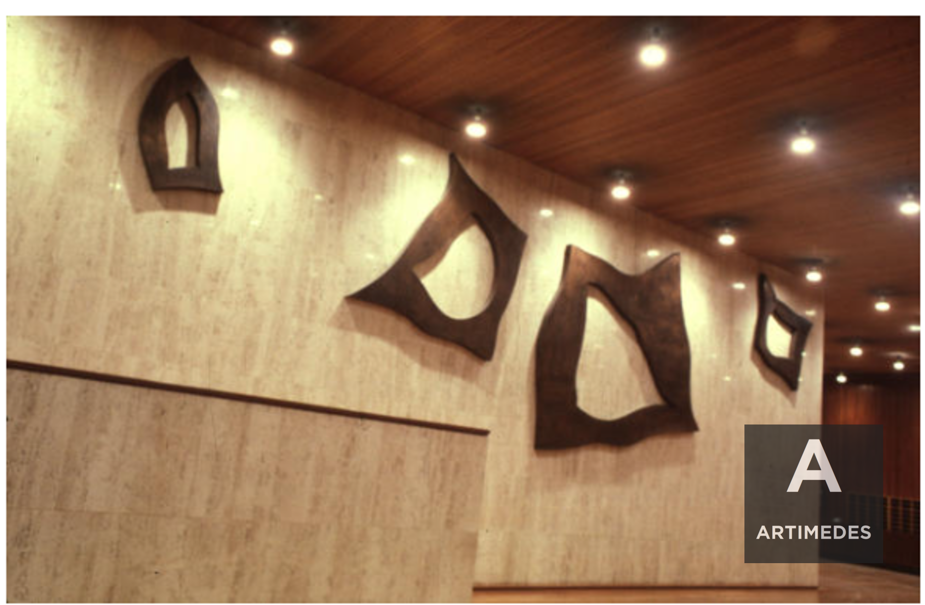 Für dieses monumentale Relief entwarf Arp eine offene Komposition aus vier Kupferelementen in den Maßen 140 x 85 cm, 250 x 220 cm, 300 x 350 cm und 145 x 190 cm, die „wie Hüte, die zurückgelassen werden können“ frei an der Wand platziert wurden Lift“, in seinen eigenen Worten. Der zufällig gewählte Hintergrund, die Wand, fungiert als Stütze und Hintergrund als Reliefelement.
